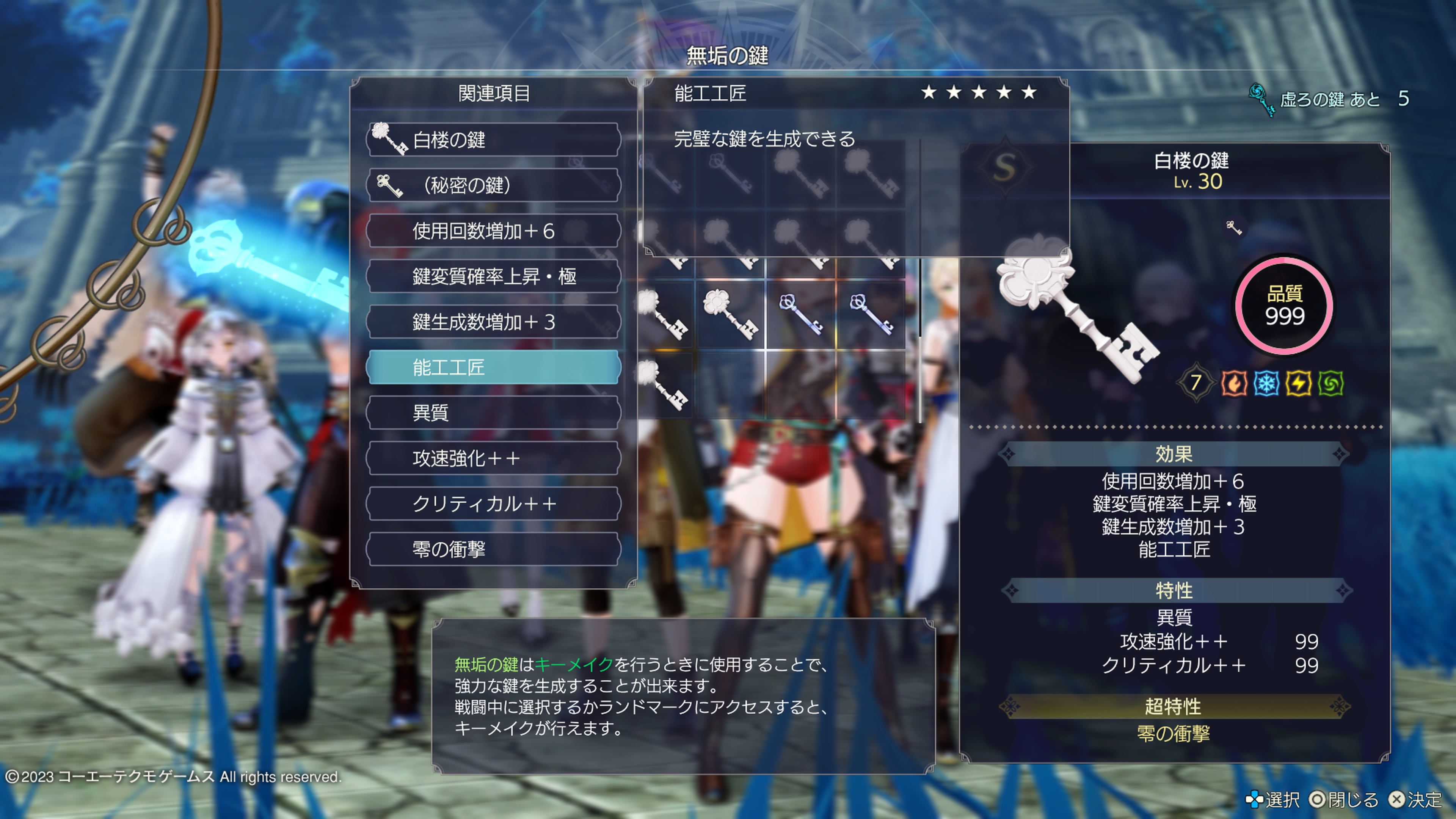 既に一通りの要素を攻略済みの場合、色々スキルツリーが増えるわりに思ったより有用なものは存在しないが、鍵使用時に素材投入回数が1回増えるので、ぎりぎりまで調合を詰めているやり込み勢には嬉しい内容