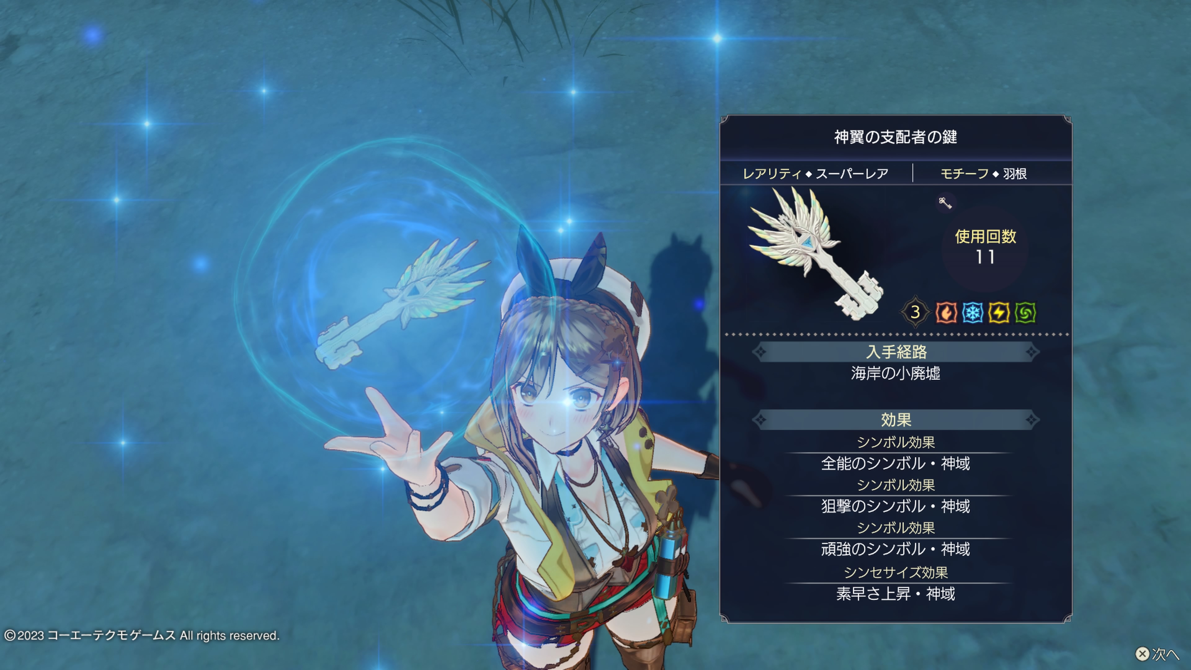 白楼の鍵の持つ「鍵変質確率」にて変質した鍵に、「絶」「神域」の効果量が出現する場合がある模様 「レアリティUP1」+「鍵変質確率上昇・極」の白楼の鍵で、「レア」の鍵で変質したものも作ることができるが、「レア」鍵だけで作れる有用なシンセサイズ効果の一つであった「属性値増加・強」などの上位効果を持つものは存在しないっぽい(属性値増加・絶、属性値増加・神域などは確認できていない) そのため、基本的にはこれまで「スーパーレア」の鍵で狙えた効果を、「極」から「神域」に置き換えるのが使い道になる |