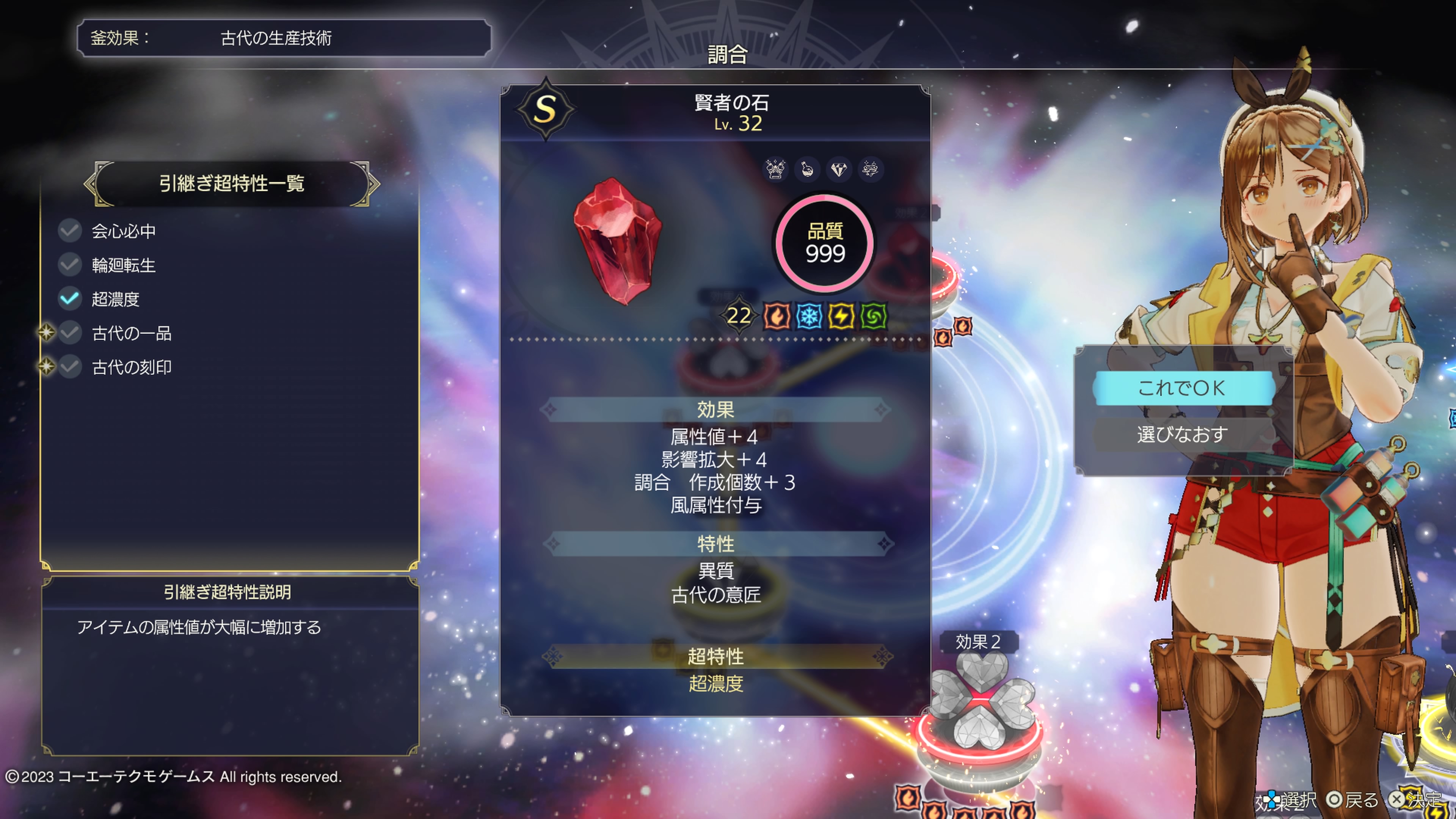 創世の社の「古代の生産技術」の釜を使うことで、属性値を高める特性「古代の意匠」を引き継げる。